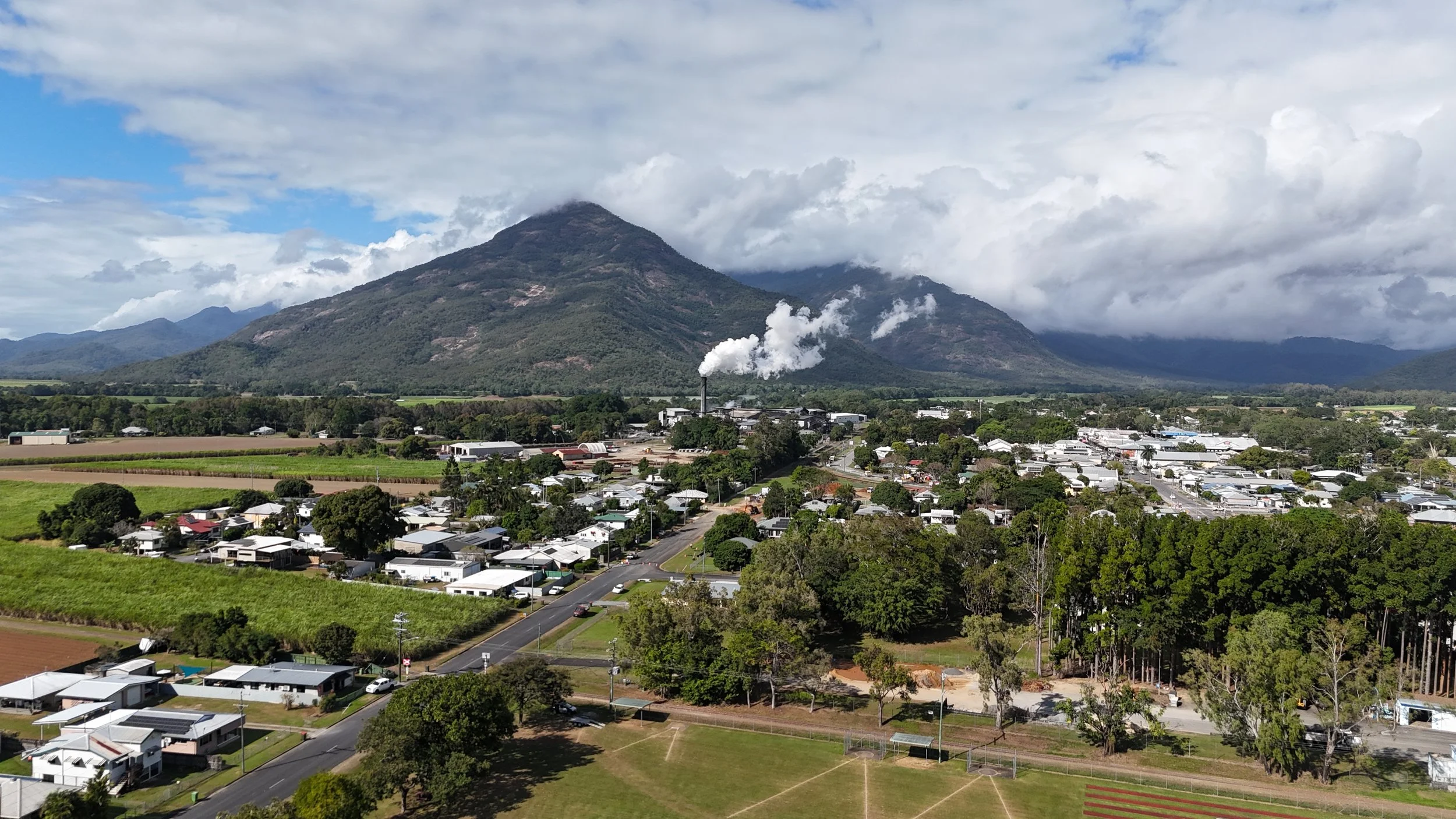 Looking South from Johnson Park, Gordonvale with the Mulgrave Central Sugar Mill and Walsh’s Pyramid in the background taken at 50m above ground level. July 2025.